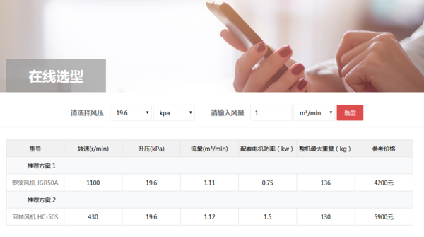 此外,还可以通过风机选型系统查询回转风机价格,如下图客户仅需输入风量、选择风压,就可以方便、快速、准确、可靠地进行罗茨鼓风机、回转式鼓风机等各类容积式风机的选型和价格查询工作。风机选型系统地址:/search.php