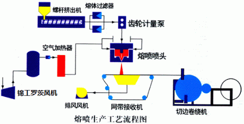 三,喷丝模头。这个是熔喷布机的最重要部位。有1块长条形喷丝板,板上布满一长列喷丝孔,一般每m长约有1500个喷孔。喷丝板两侧面装有热空气喷管,下装有热空气喷孔,与喷丝孔成50b角,使纤维喷出之后,即刻用高速热空气进行气流拉伸,把纤维吹断,成为超细纤维。 产线都会有配,设计和精度直接影响拉丝的长度、均匀性、韧性、细度等诸多方面,从而对最终的卷材质量产生决定性影响。