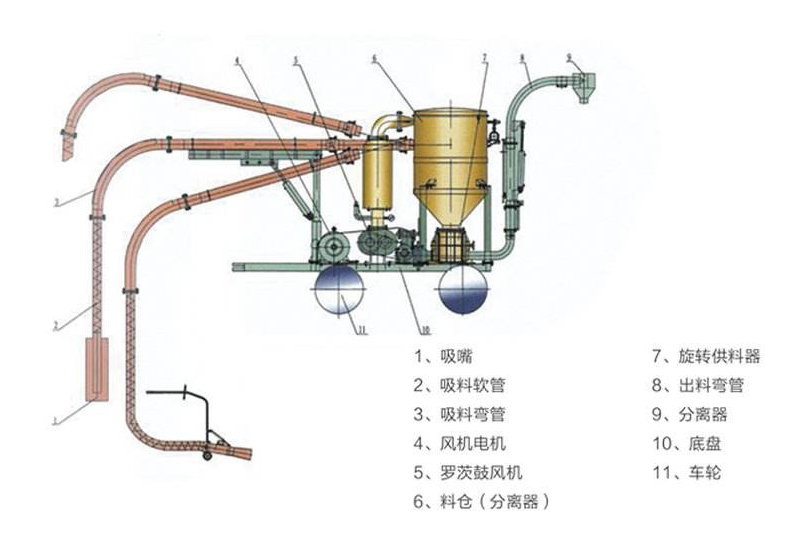 负压系统适宜于从多喂料点输送物料到一个卸料点。它的优点是通过供料器的空气泄漏和压力降都很小,因而旋转叶片供料器能得到令人满意的使用效果。