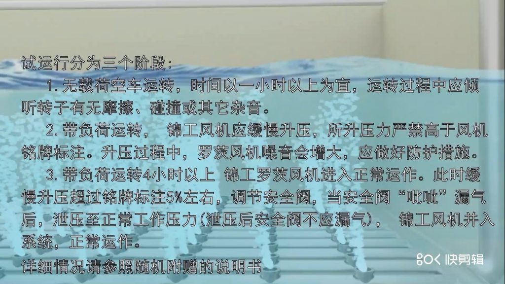 相关人员远离鼓风机机组2米以外,进行开机试运行,试运行分为三个阶段: