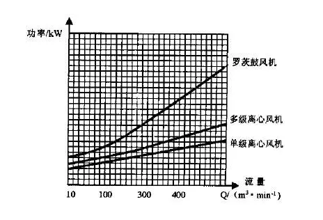 三种风机的能耗对比见:三种风机流量—功率曲线图(见图1) 。在流量较小时,三种风机效率差异不是很显著;对于大流量风机,由于罗茨式转速无法提高,效率较低;另两种离心风机差距较小。