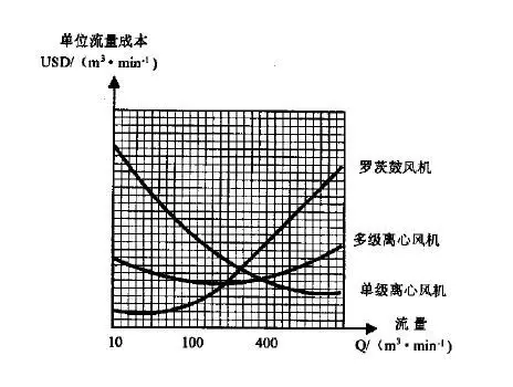 三种风机的投资成本对比见:三种风机流量—单位流量成本曲线图(见图2)。从上面曲线图可以看出: